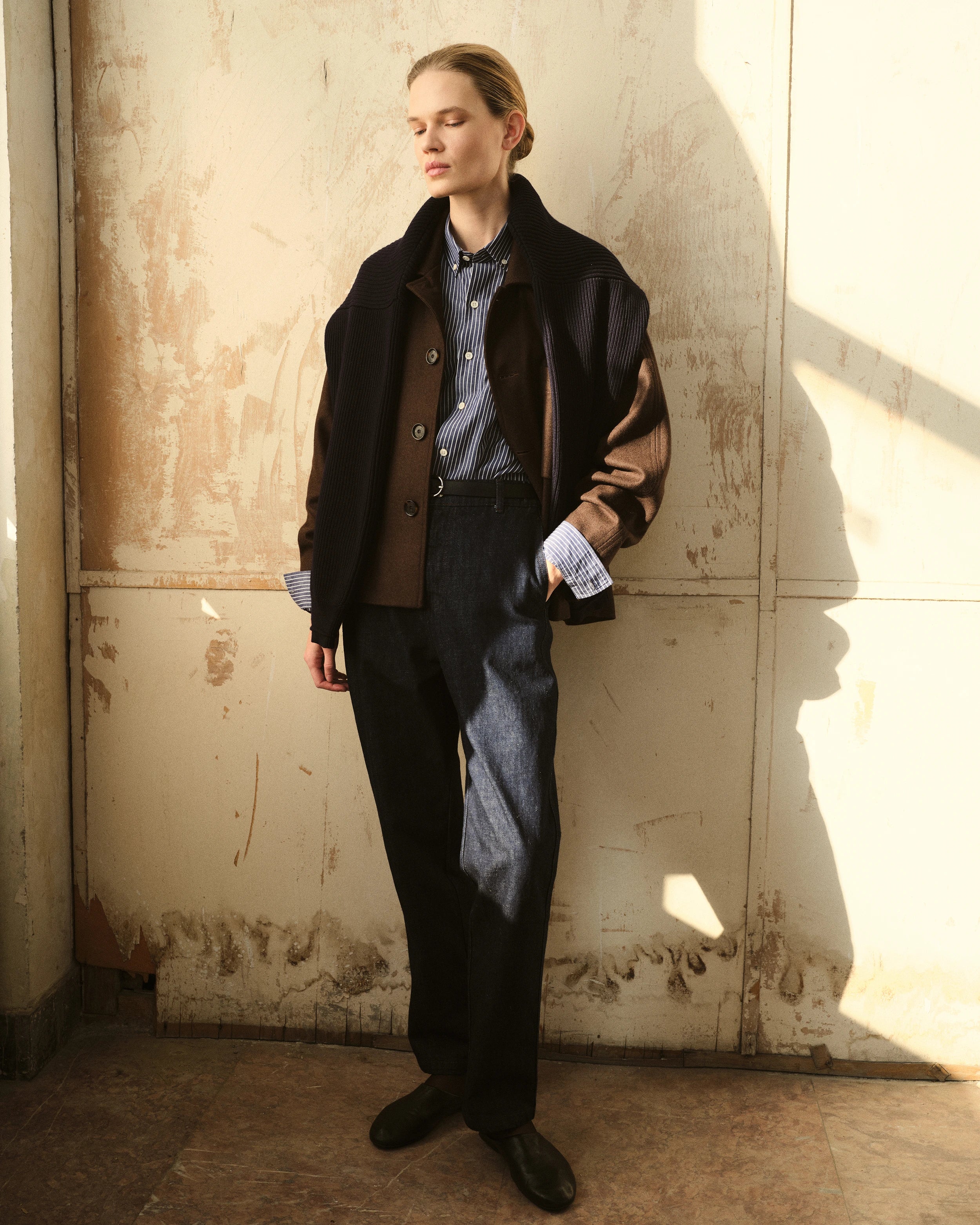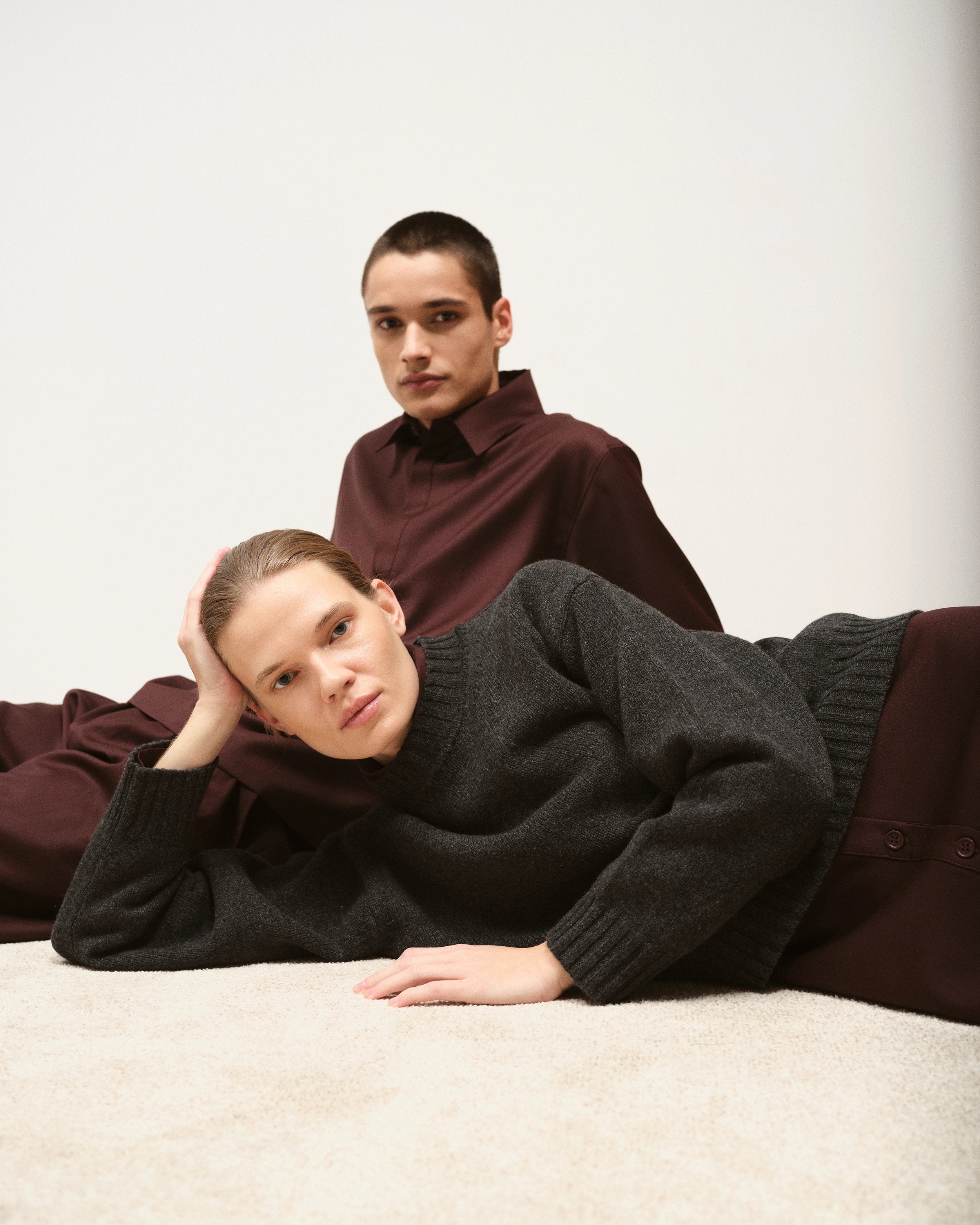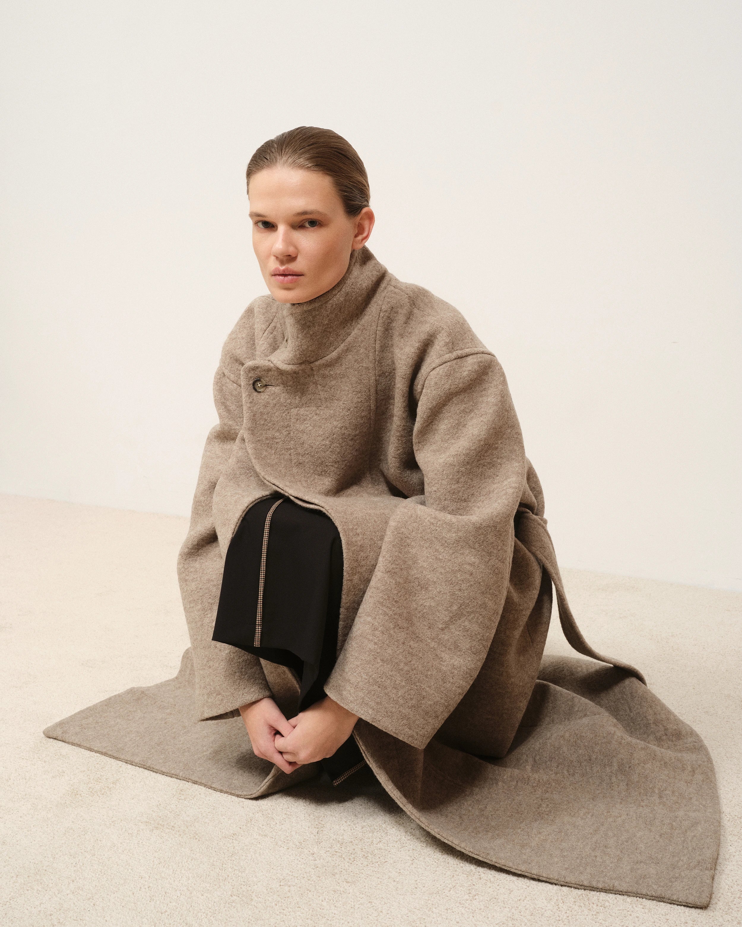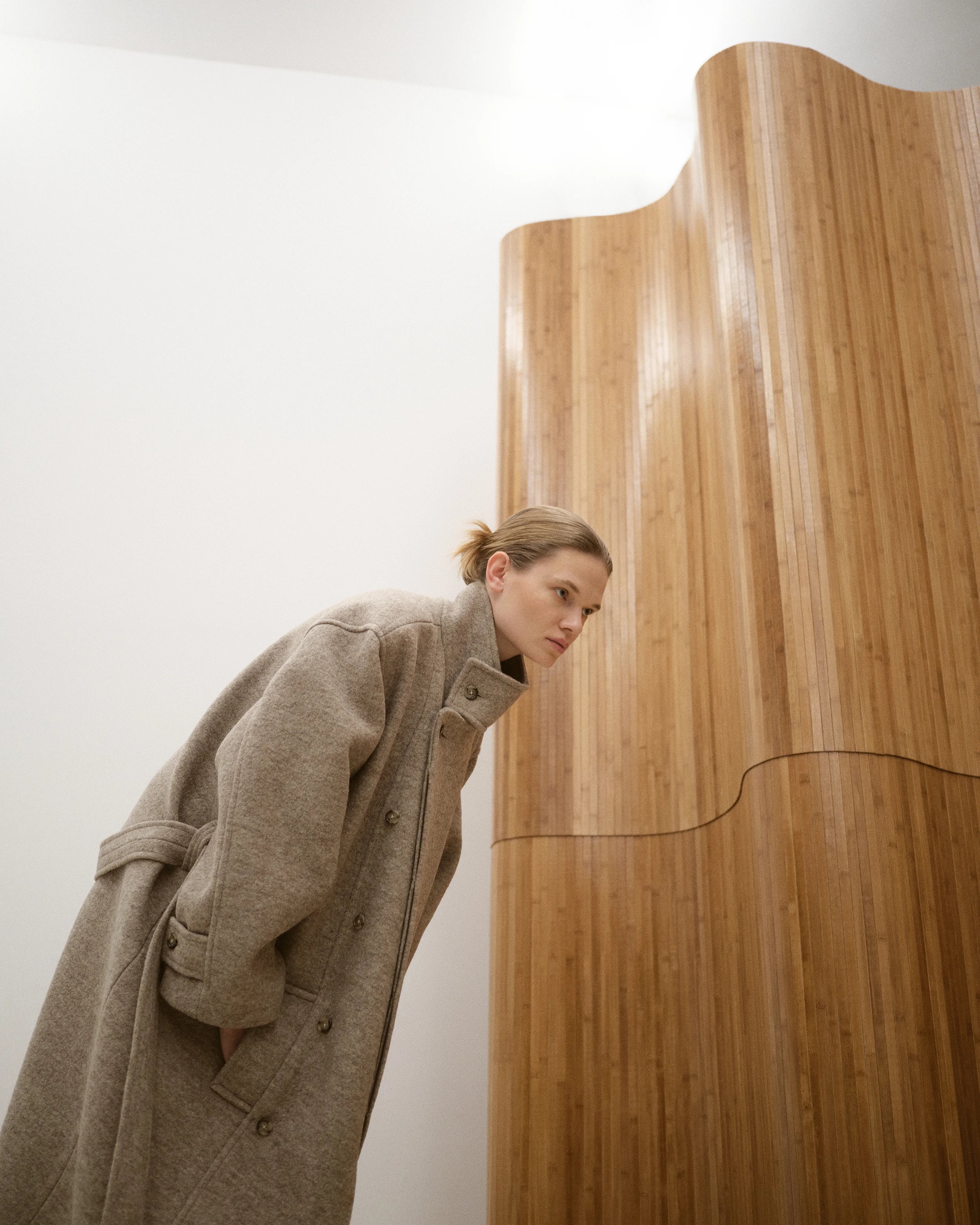 The cuts remain fluid and elegant, the raw and natural materials offer a soft, protective, almost refuge-like feel.