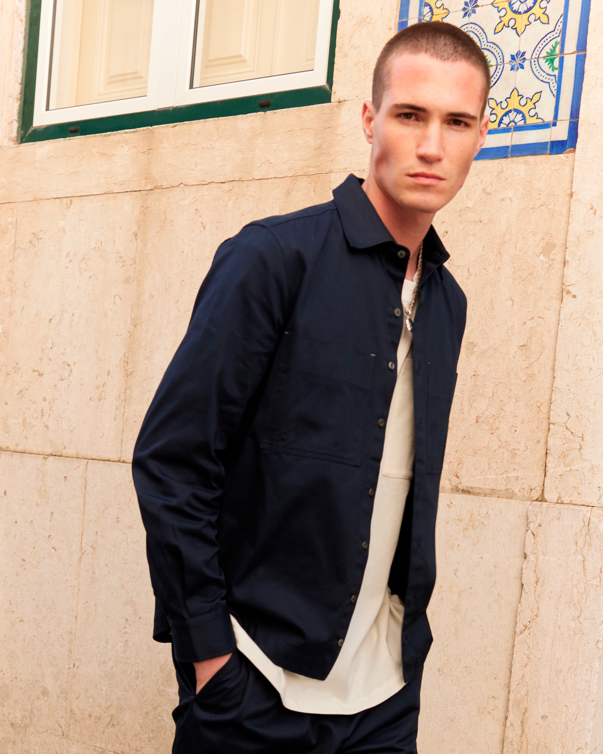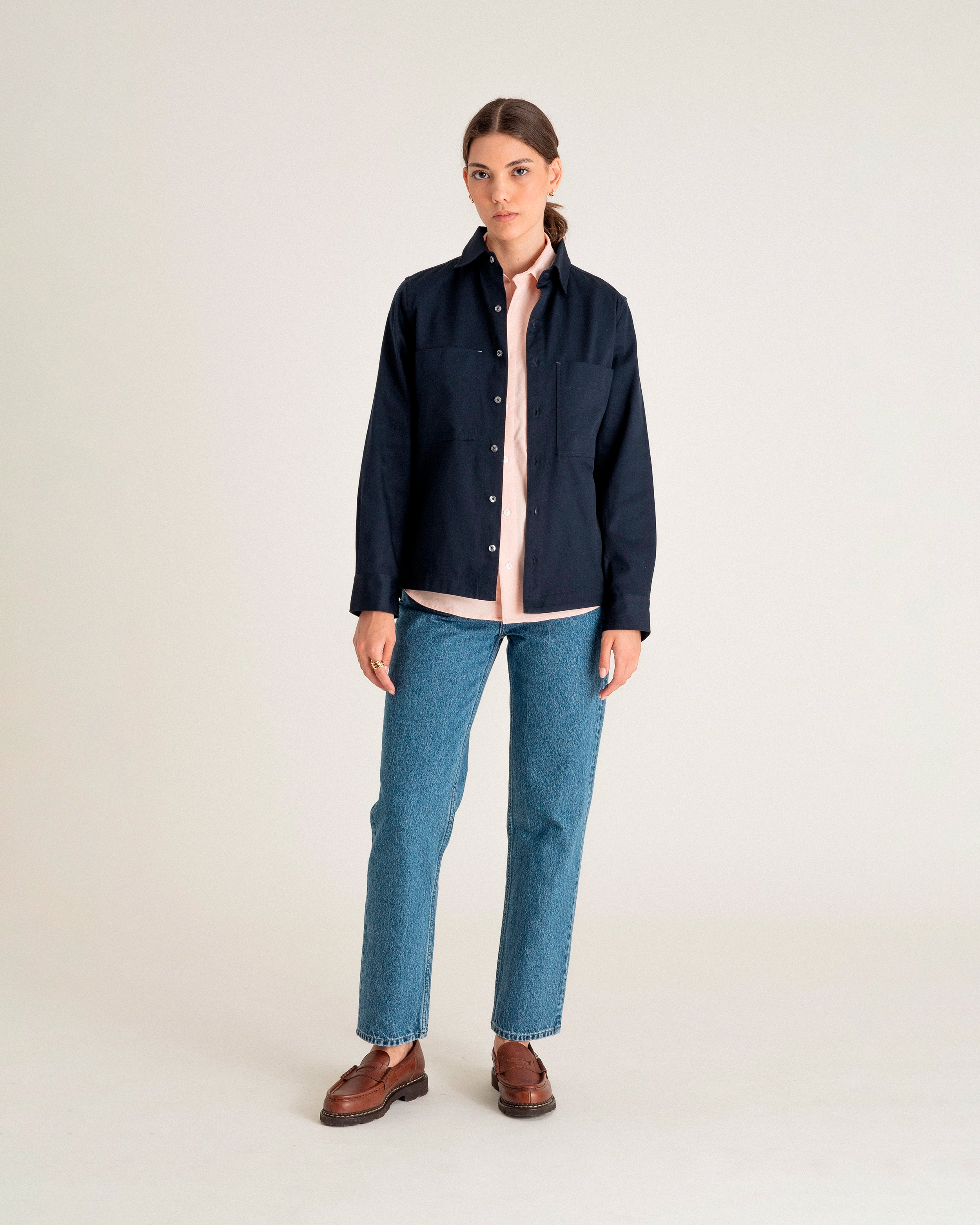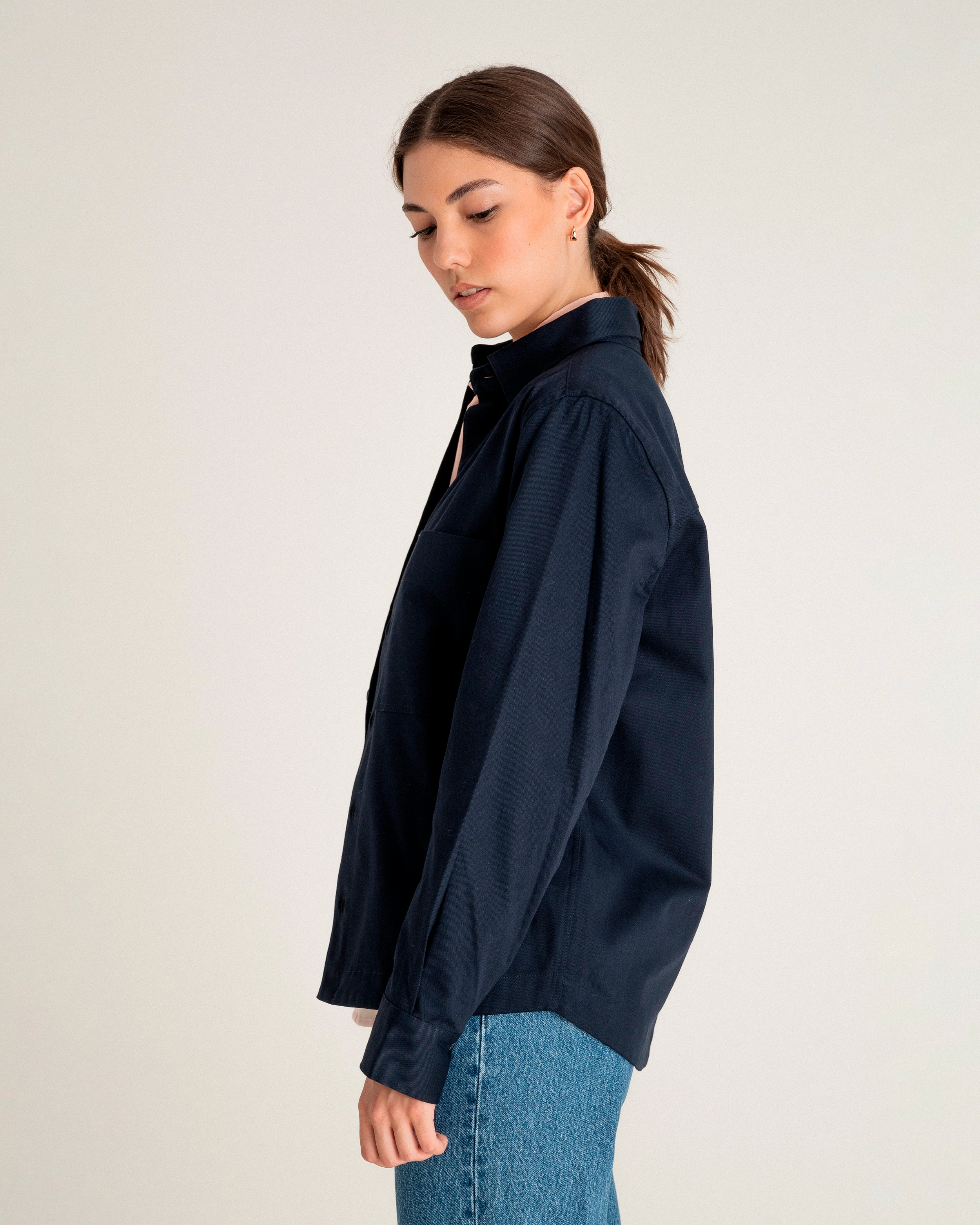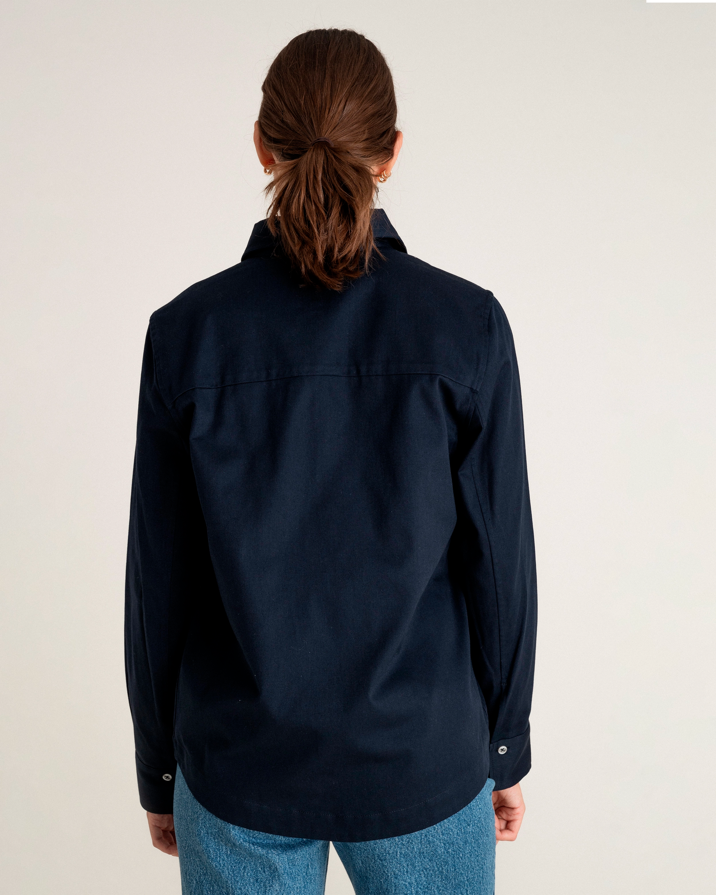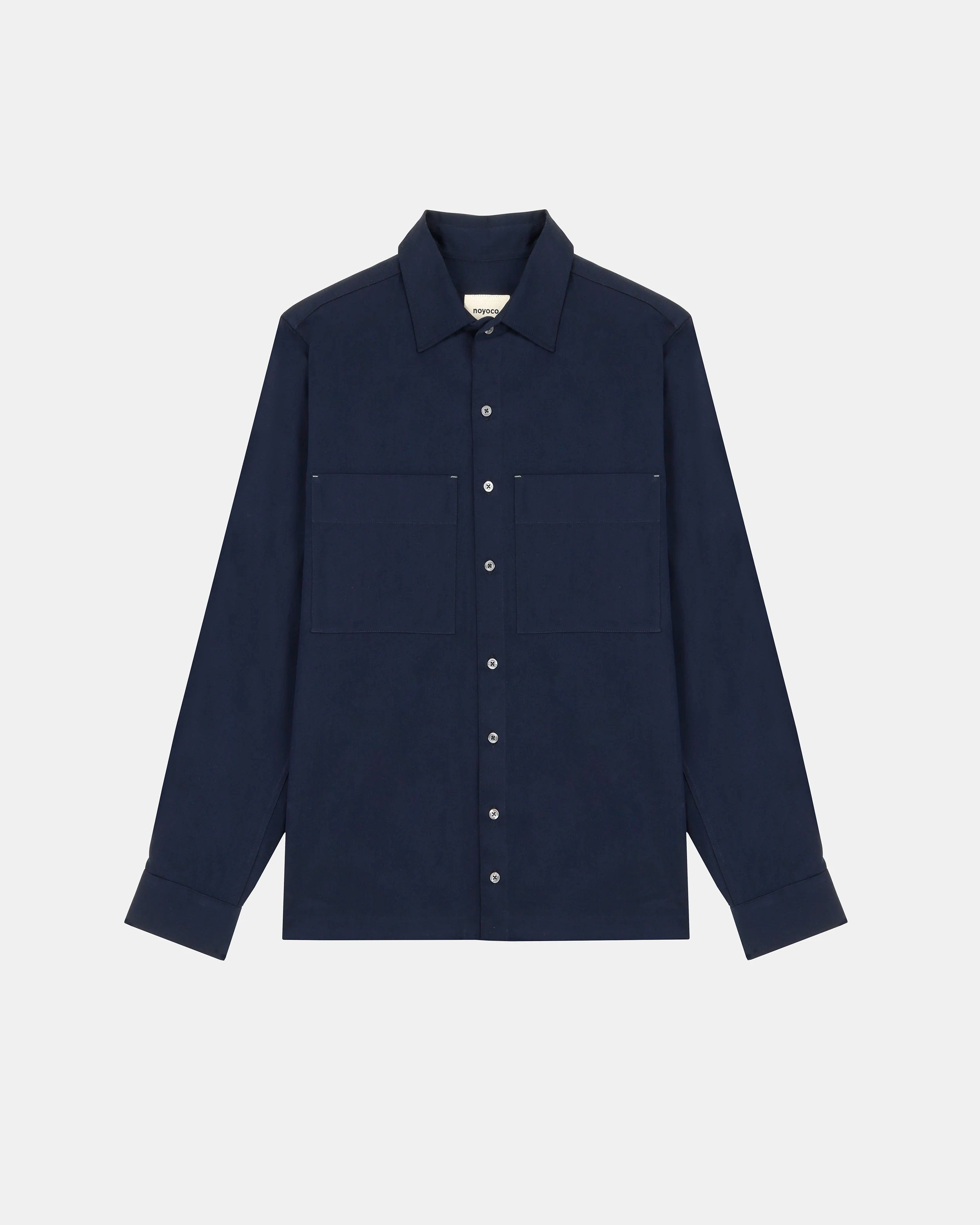 The noyoco unisex overshirt with large patch pockets made from organic cotton. Straight cut. Classic collar. Stitched metal button closure. Tear-resistant slit finish and button cuffs. Slightly rounded at bottom. Every piece in the noyoco wardrobe is made in Europe, from the material to the garment.