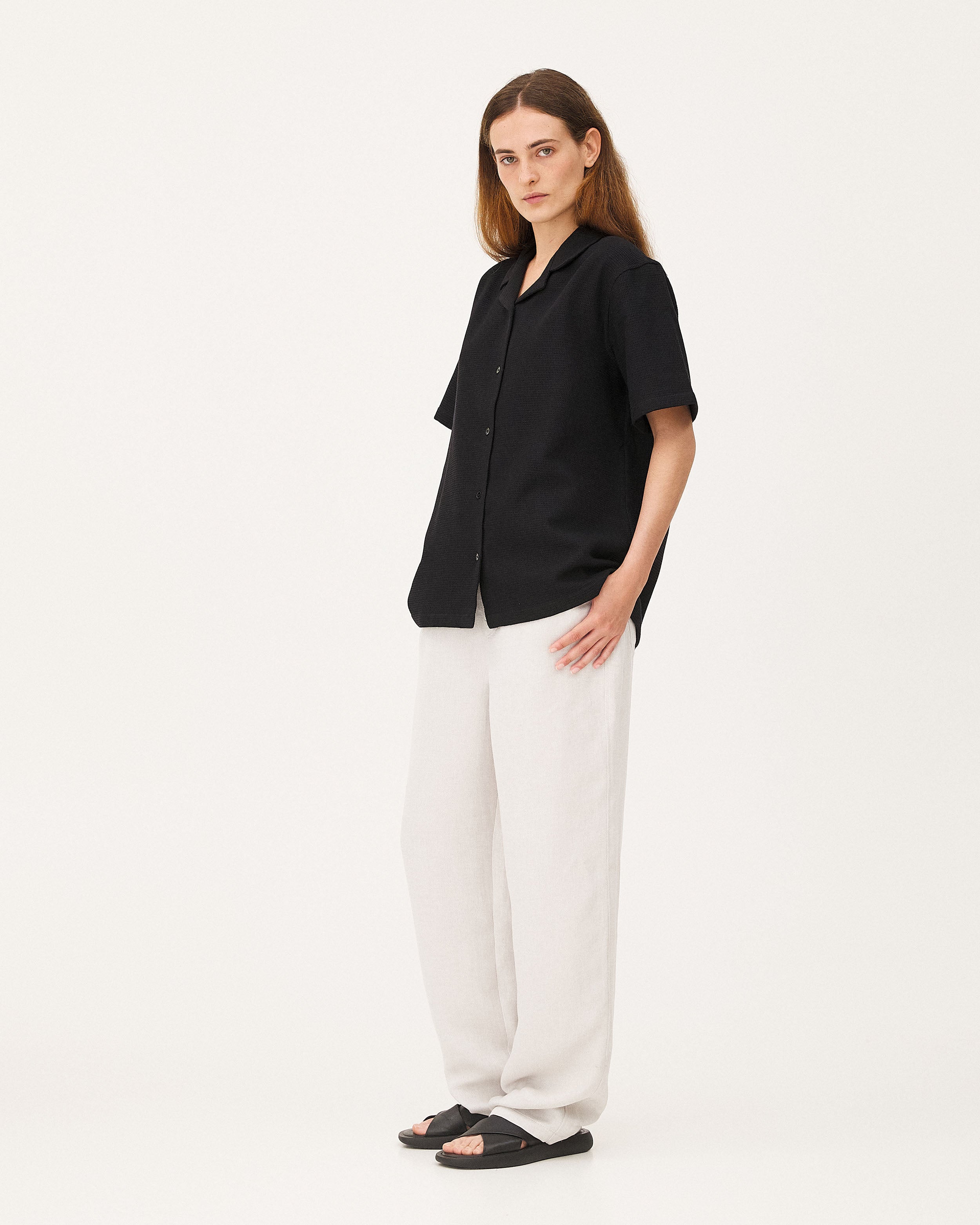 Le reste de nos matières nous vient de nos tisseurs préférés, des grandes maisons d'Italie et du Portugal, principalement. Elles sont naturelles, biologiques ou recyclées. Lin, chanvre, lyocell, laine vierge, coton bio... Elles ont leurs caractéristiques propres et consomment moins de ressources naturelles, émettent moins de CO2, ne nécessitent pas de pesticides, ne relâchent pas de produits chimiques dans l'environnement, sont recyclables et biodégradables. Travailler uniquement des matières à faible impact nous permet de réduire considérablement l'impact environnemental de nos collections.