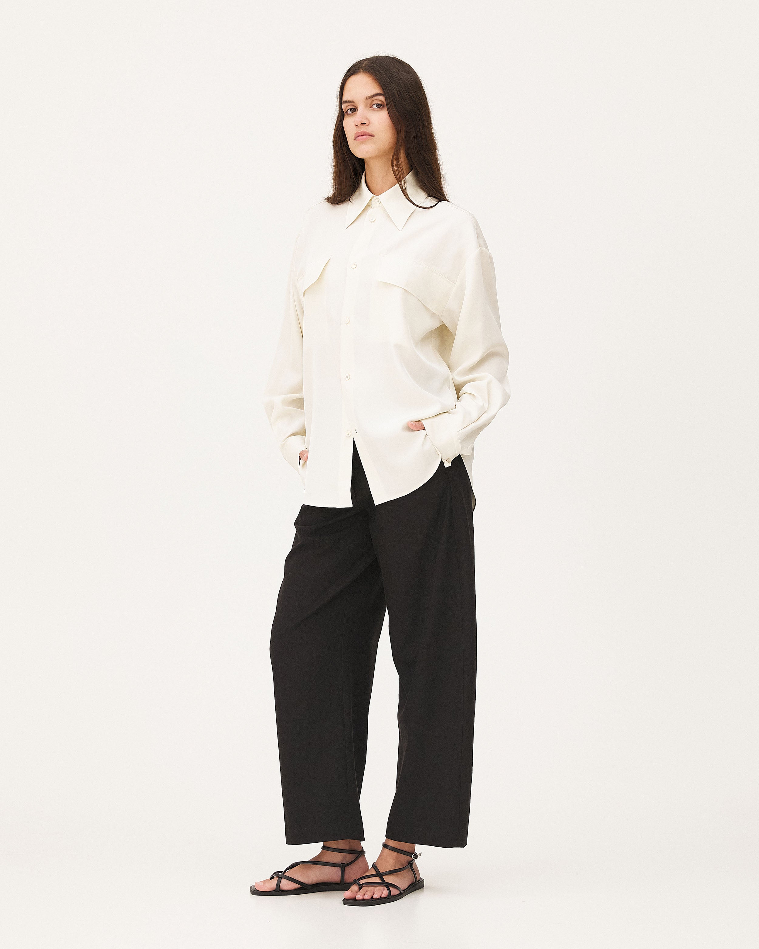 Coupe ample, jambe arrondie.